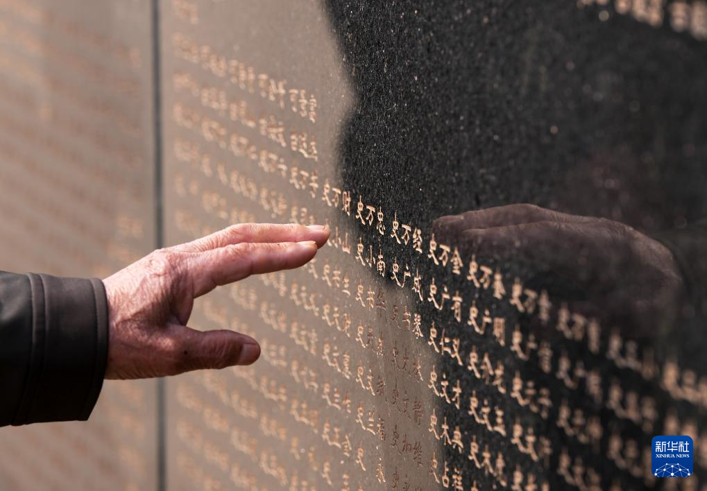 4月3日,在沈陽抗美援朝烈士陵園,史榮升老人手指輕觸刻有父親名字的烈士英名墻。 新華社記者 李鋼 攝