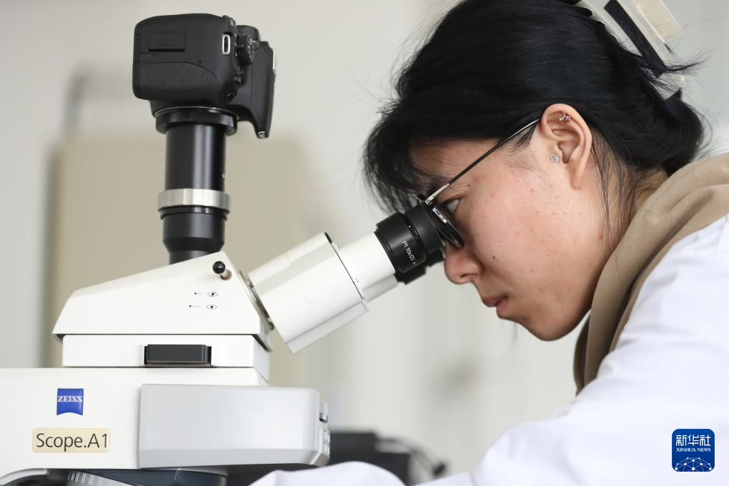 4月3日,在位于沈陽農業大學的土肥高效利用國家工程研究中心實驗室,工作人員在觀察土壤微形態薄片。新華社記者 楊青 攝