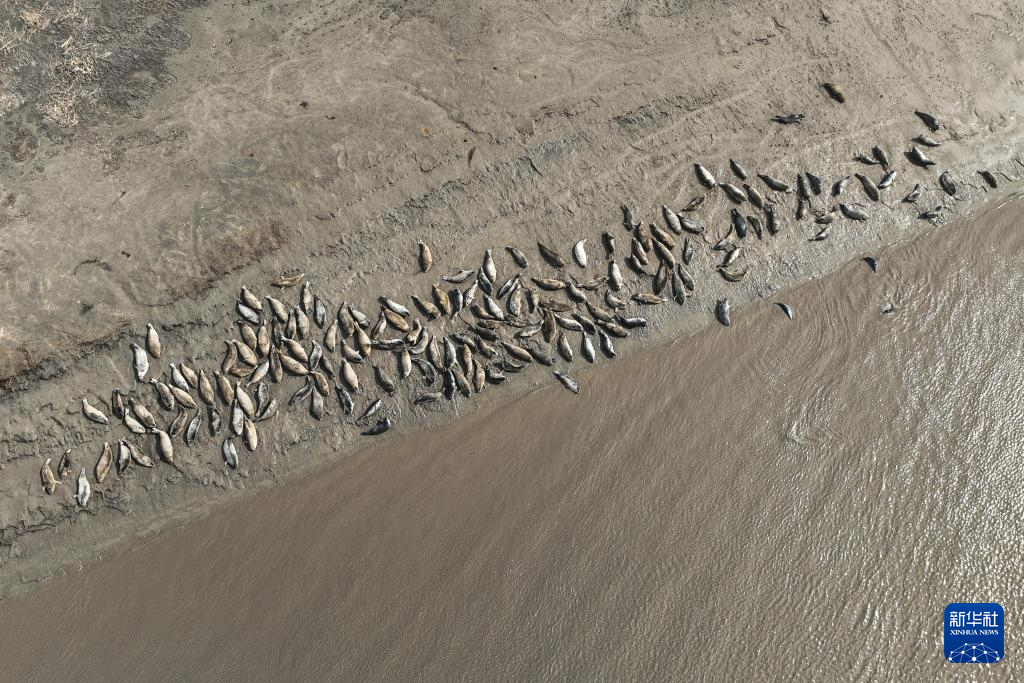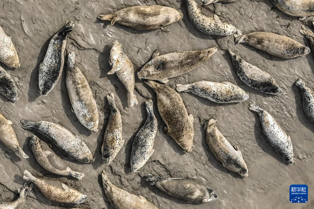 4月9日,西太平洋斑海豹在遼寧盤錦三道溝海域的灘涂上休息(無人機照片)。新華社記者 潘昱龍 攝