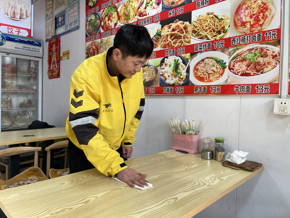 說起自己成為外賣騎手,朱海笑言是機緣巧合?!?021年前后,餐飲生意冷清,我尋思總得干點什么。正好這時候美團外賣在招聘騎手,我就去應聘了?!碑敃r,兼職騎手每天只需跑10單就能有100多元的收入,也不影響自己的面館生意,這對朱海來說十分難得。更為重要的是,騎手這一角色也讓他了解到周邊顧客的點餐偏好,為實體店鋪的經營打開了新視角。