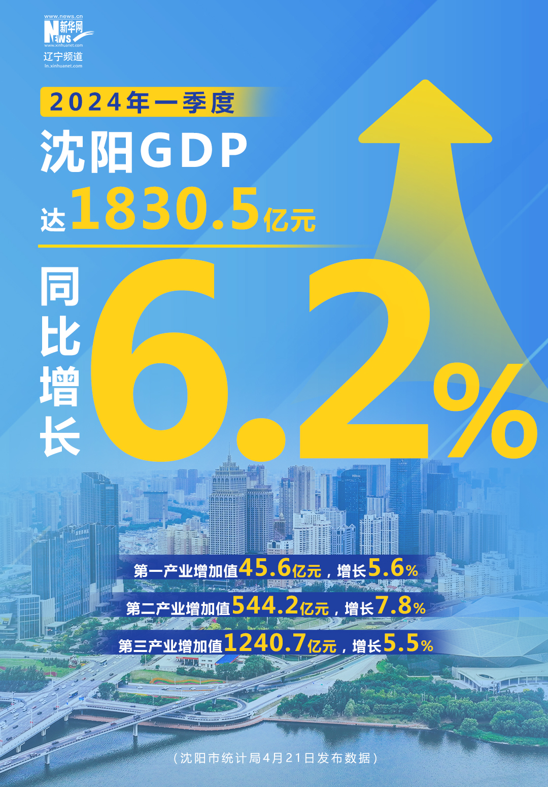 根據地區生產總值統一核算結果,一季度,沈陽市地區生產總值達1830.5億元,按不變價格計算,同比增長6.2%。其中,第一產業增加值45.6億元,增長5.6%;第二產業增加值544.2億元,增長7.8%;第三產業增加值1240.7億元,增長5.5%。