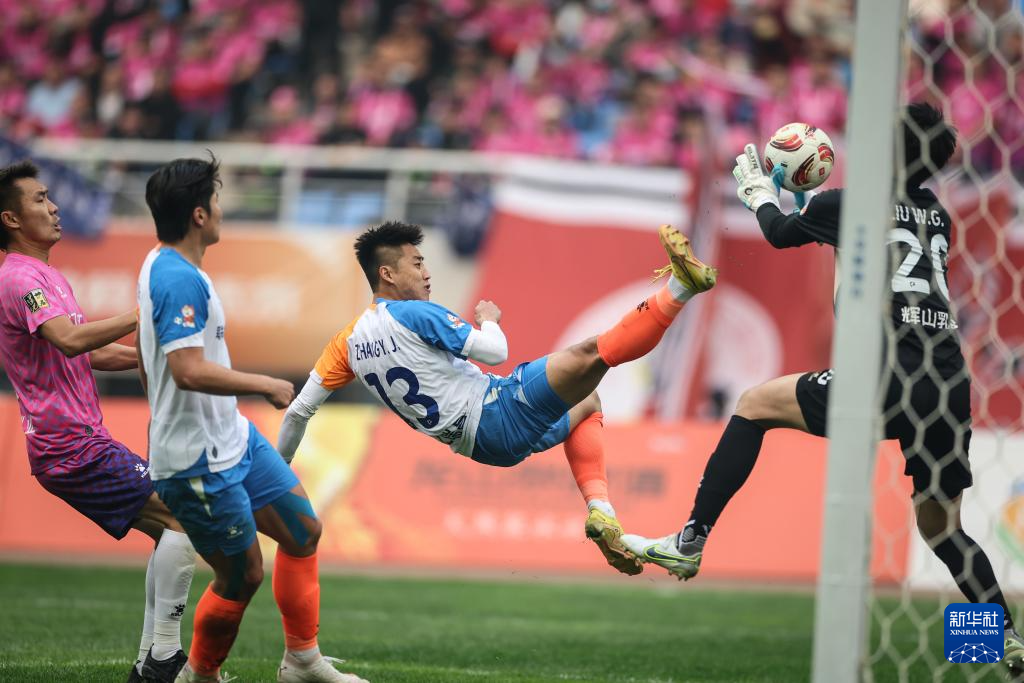 4月20日,江西廬山隊球員張延軍(右二)在比賽中射門。新華社記者 潘昱龍 攝