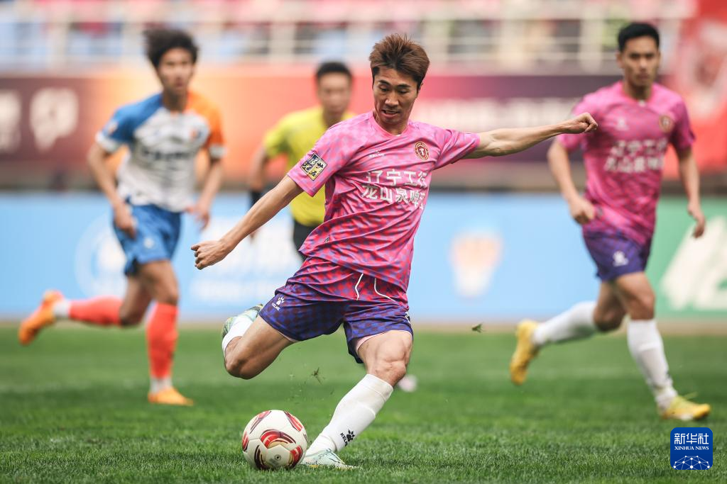 4月20日,遼寧鐵人隊球員段云子(前)在比賽中射門。新華社記者 潘昱龍 攝