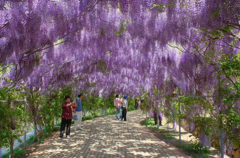 微風拂過,紫藤花隨風飄蕩。漫步在千米長的紫藤長廊下,仿佛置身于夢幻般的紫色世界。據介紹,這份“紫色浪漫”將持續至5月中下旬。離紫藤長廊不遠處的油菜花田內,油菜花花開正艷,燦爛奪目,形成一片金燦燦的花海。