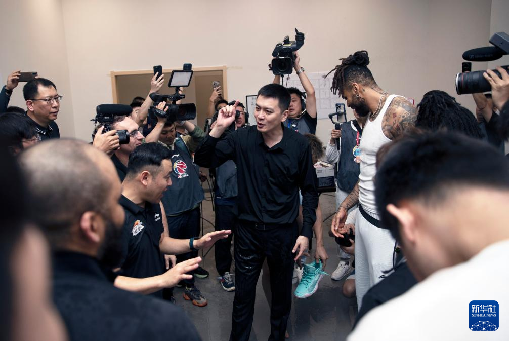 5月22日,遼寧本鋼隊主教練楊鳴(中)奪冠后在球隊更衣室發言。