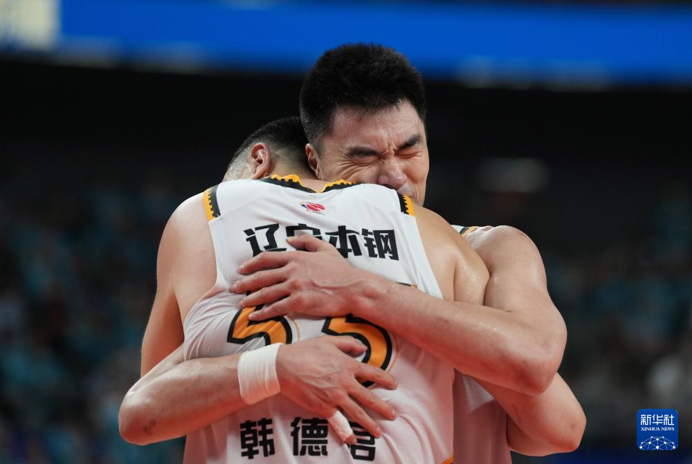 5月22日,遼寧本鋼隊球員韓德君(前)與隊友李曉旭擁抱慶祝奪冠。