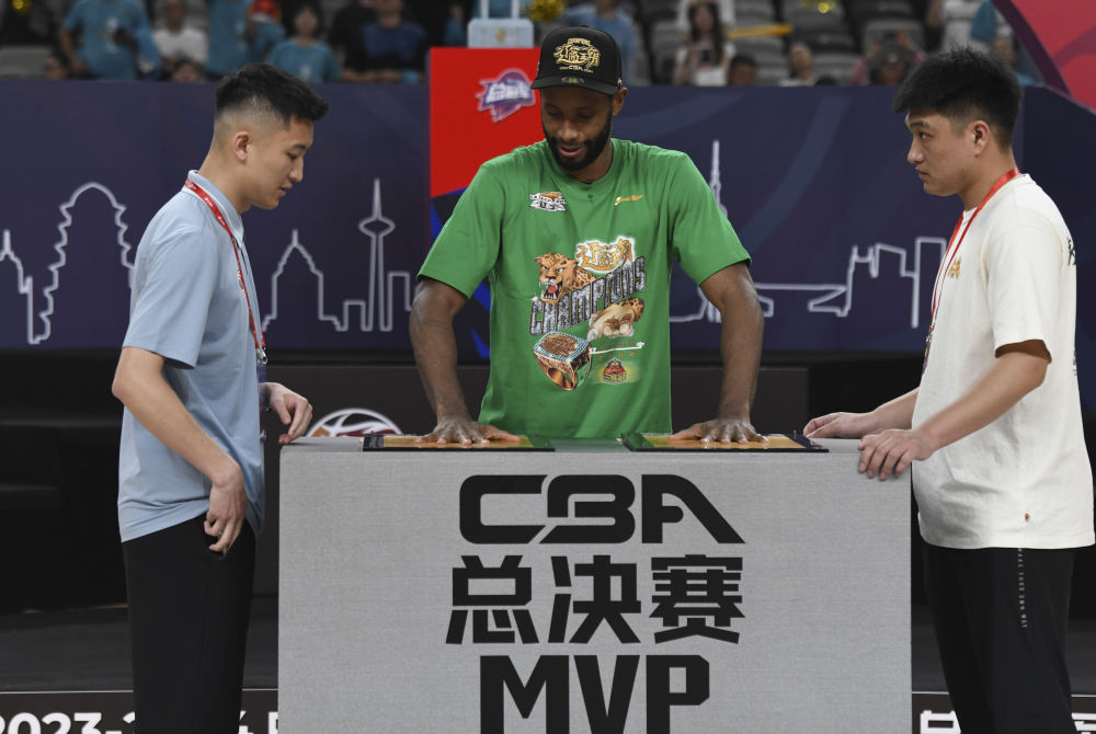 5月22日,遼寧隊球員弗格(中)在當選總決賽最有價值球員后按下手印。新華社記者 王菲 攝