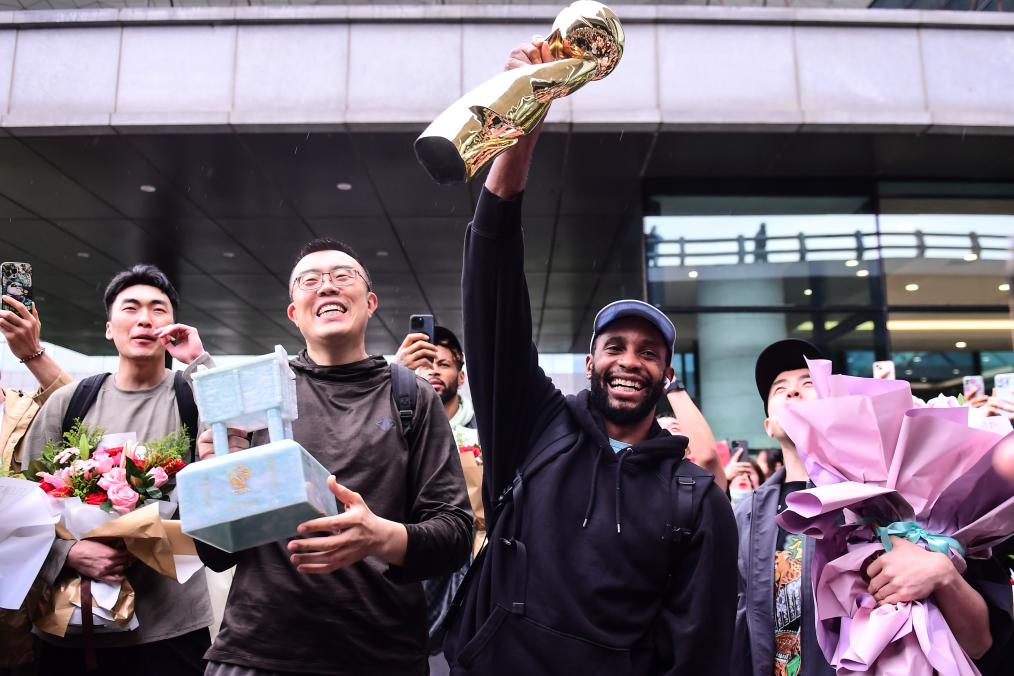 5月23日,遼寧隊球員弗格(右二)和隊友韓德君(左二)向球迷展示總決賽最有價值球員(FMVP)獎杯和冠軍鼎。新華社發