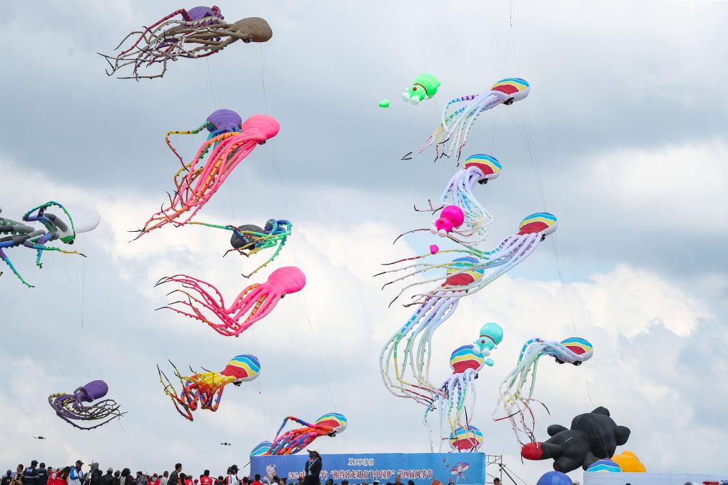 除了競技項目,現場同步進行著大型軟體風箏表演,蜈蚣、魷魚等各式各樣造型的軟體風箏競相飛上天空,上演“天空動物園”,場面蔚為壯觀,吸引了大量參觀者拍照“打卡”。