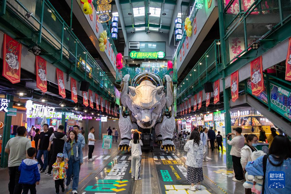5月25日,游客在大連熊洞街參觀仿生機械巨熊。新華社記者 李旭倫 攝