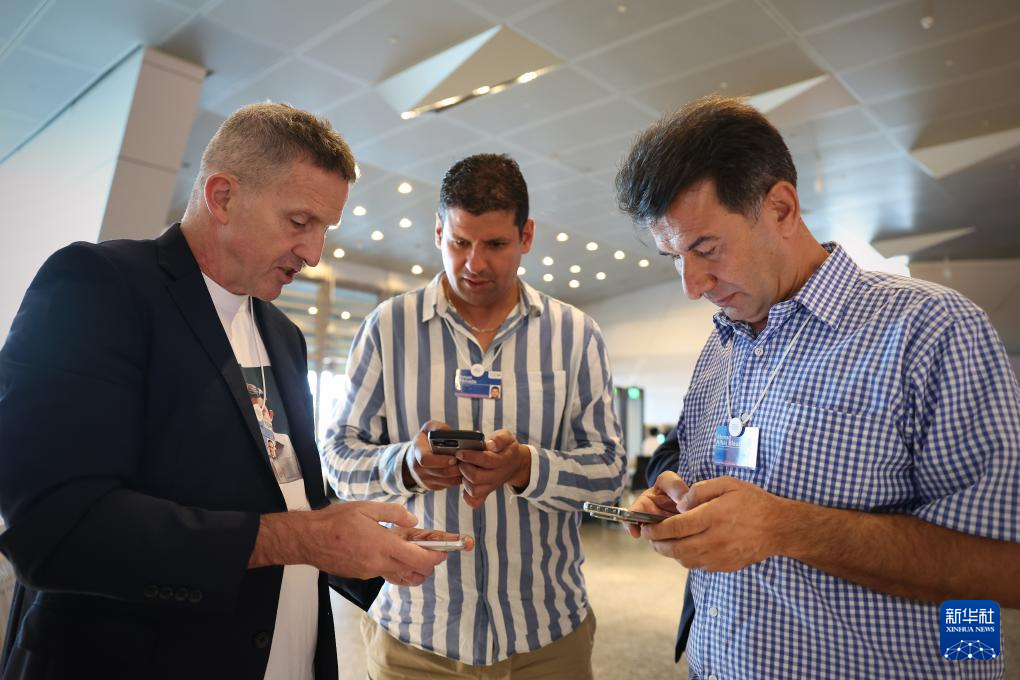 6月26日,三位嘉賓在夏季達沃斯論壇主會場大連國際會議中心內分享聯系方式。新華社記者 姚劍鋒 攝
