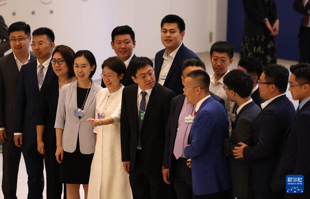 6月26日,嘉賓在夏季達沃斯論壇主會場大連國際會議中心內合影。新華社記者 姚劍鋒 攝pagebreak