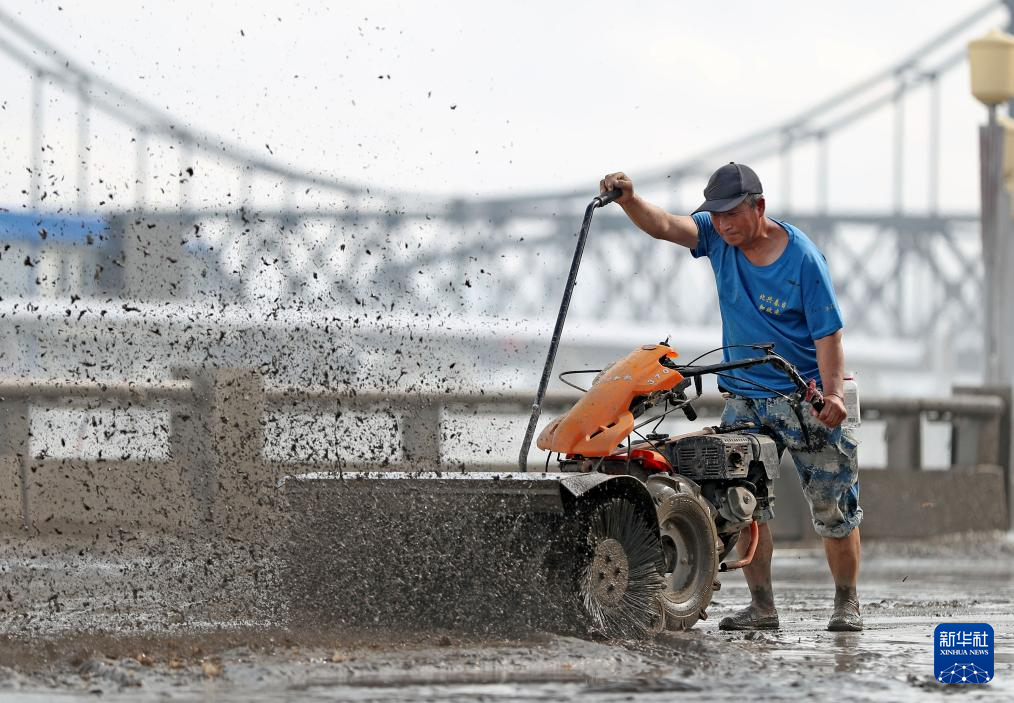 8月1日,工作人員在丹東市鴨綠江公園清理淤泥。新華社記者 龍雷 攝pagebreak