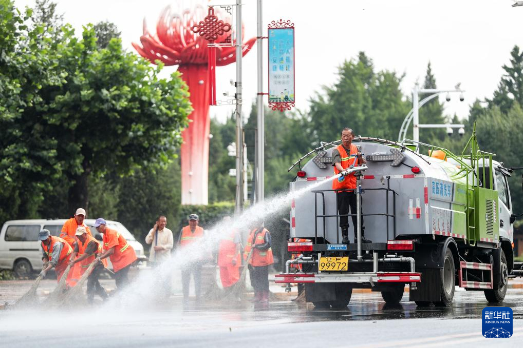 8月1日,作業車輛在丹東市濱江中路清理淤泥。新華社記者 龍雷 攝