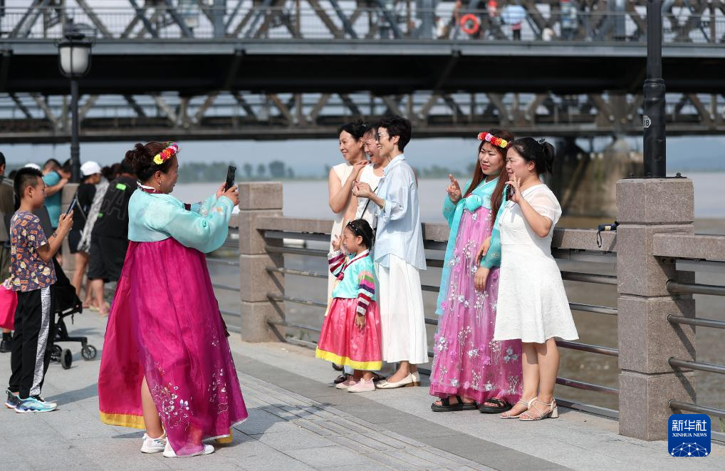 8月2日,游客在鴨綠江畔留影。新華社記者 龍雷 攝