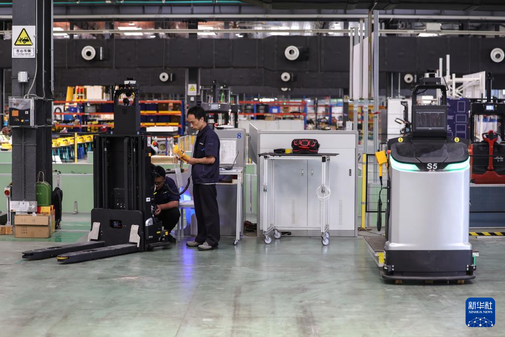 6月4日,沈陽新松機器人自動化股份有限公司的機器人研發工程師在調試叉式移動機器人。