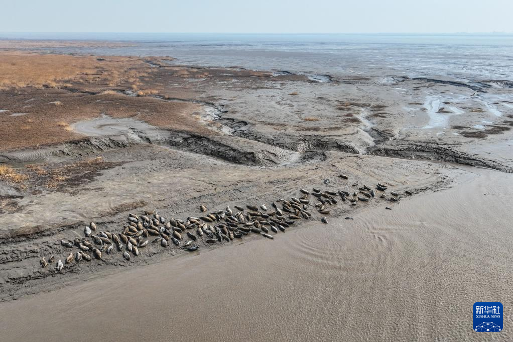 西太平洋斑海豹在遼寧盤錦三道溝海域的灘涂上休憩(4月9日攝,無人機照片)。