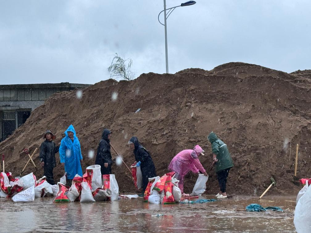 當地黨員干部、群眾在烏牛堡子村村委會門口裝沙袋。(受訪者供圖)