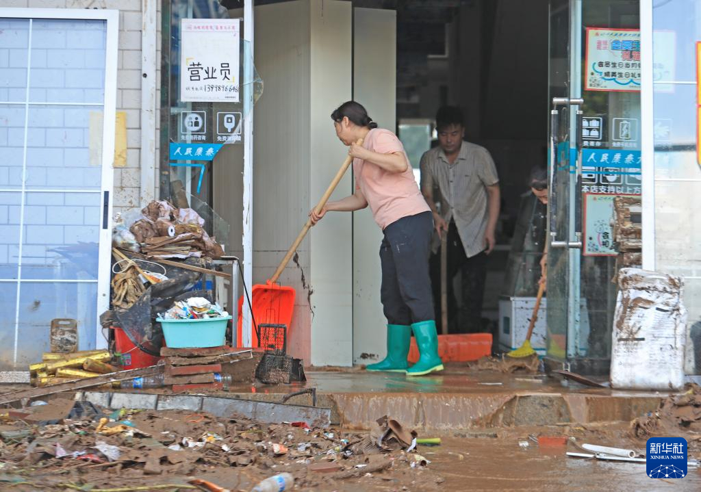 8月21日,在建昌縣黑山科鄉,受災居民在清理店鋪內積水。新華社記者 楊青 攝pagebreak