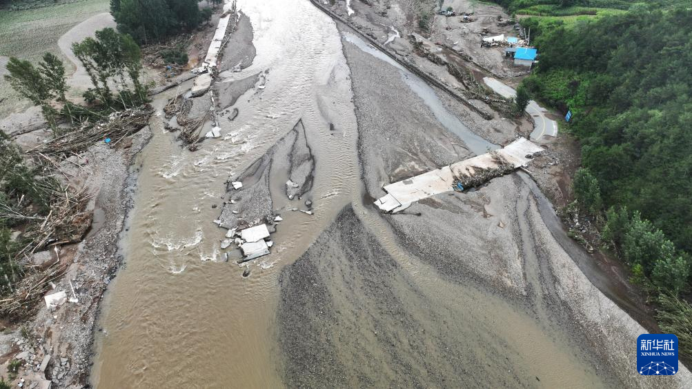 8月21日,在建昌縣黑山科鄉,一條河流上的橋梁被沖毀(無人機照片)。新華社記者 楊青 攝