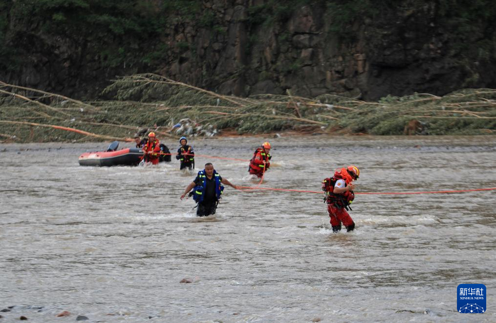 8月21日,在建昌縣黑山科鄉,來自山東的救援隊伍給對岸受災群眾送去醫療物資后渡河返回。新華社記者 楊青 攝pagebreak