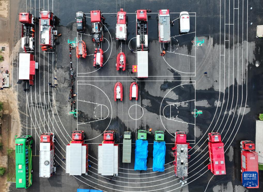 8月21日在建昌縣黑山科鄉初級中學拍攝的各方救援車輛(無人機照片)。新華社記者 楊青 攝pagebreak