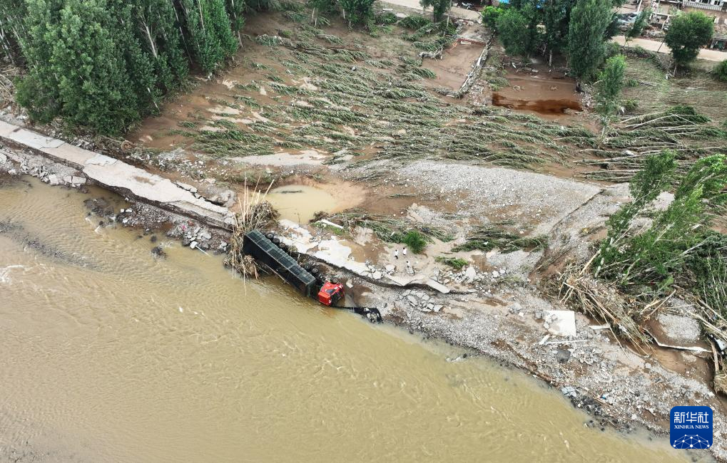 8月21日,在建昌縣黑山科鄉, 一輛貨車被洪水沖毀(無人機照片)。新華社記者 楊青 攝pagebreak