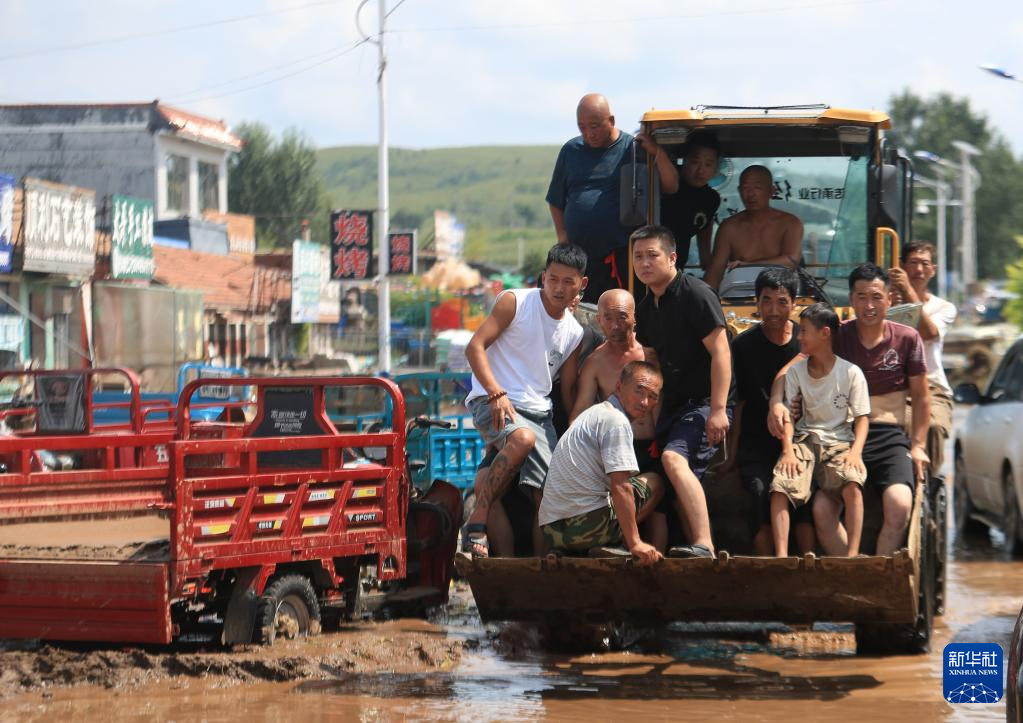 8月21日,在建昌縣黑山科鄉,受災居民乘鏟車進行轉移。新華社記者 楊青 攝