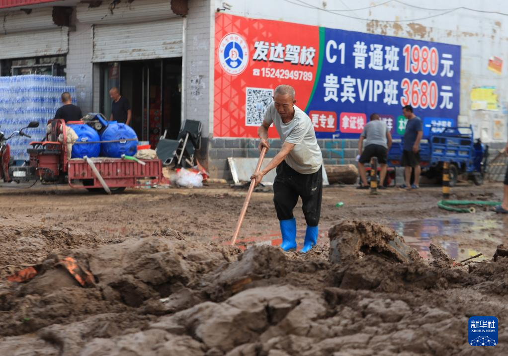 8月21日,在建昌縣黑山科鄉,一名居民在清理道路淤泥。新華社記者 楊青 攝pagebreak