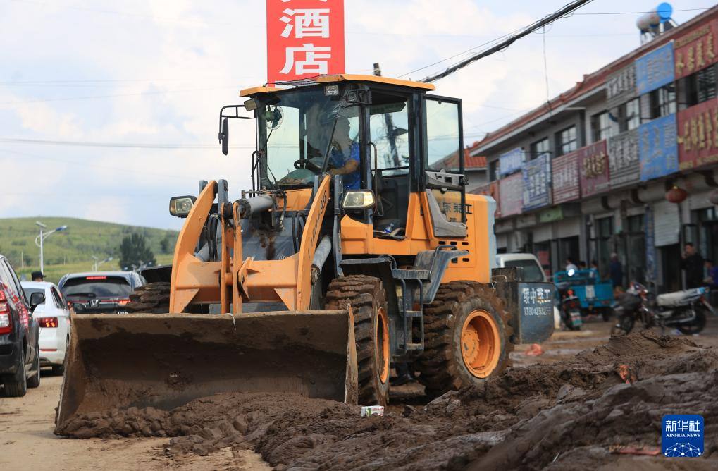 8月21日,在建昌縣黑山科鄉,救援車輛在清理道路淤泥。新華社記者 楊青 攝pagebreak