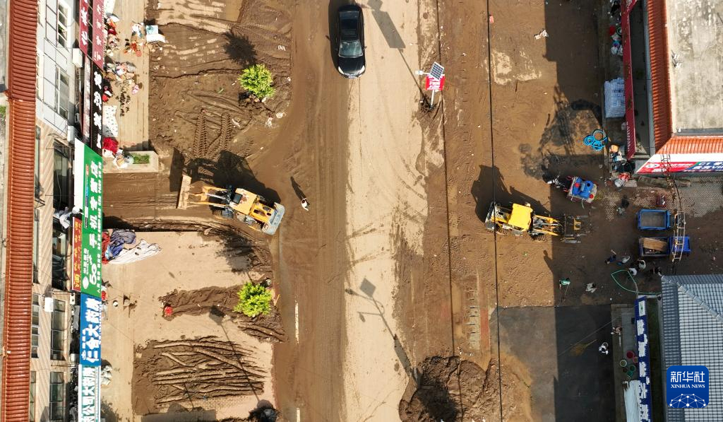 8月21日,在建昌縣黑山科鄉,救援車輛在清理道路淤泥(無人機照片)。新華社記者 楊青 攝pagebreak