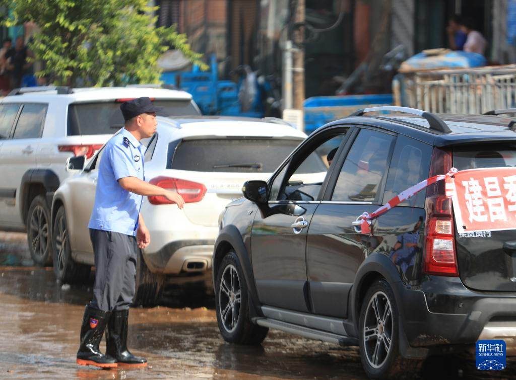 8月21日,在建昌縣黑山科鄉,派出所民警在指揮交通。新華社記者 楊青 攝pagebreak