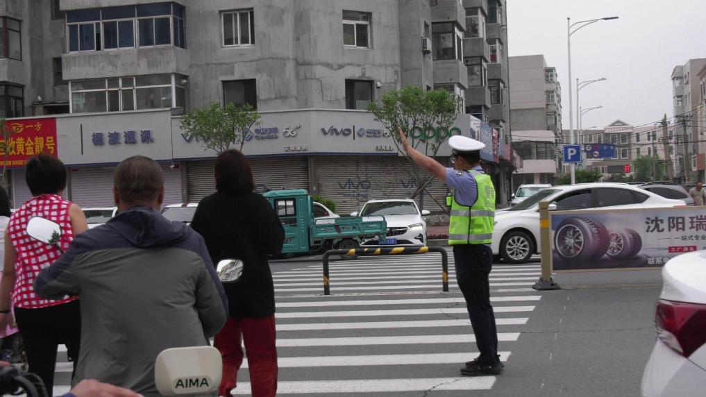 開原市公安交通警察大隊的交警正在疏導校園周邊的車輛。(開原市紀委監委供圖)