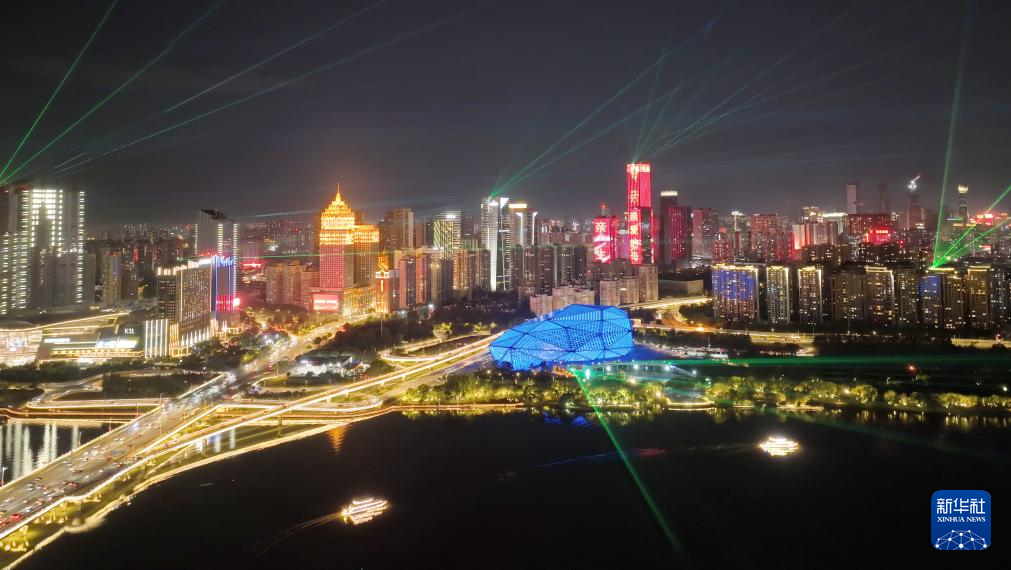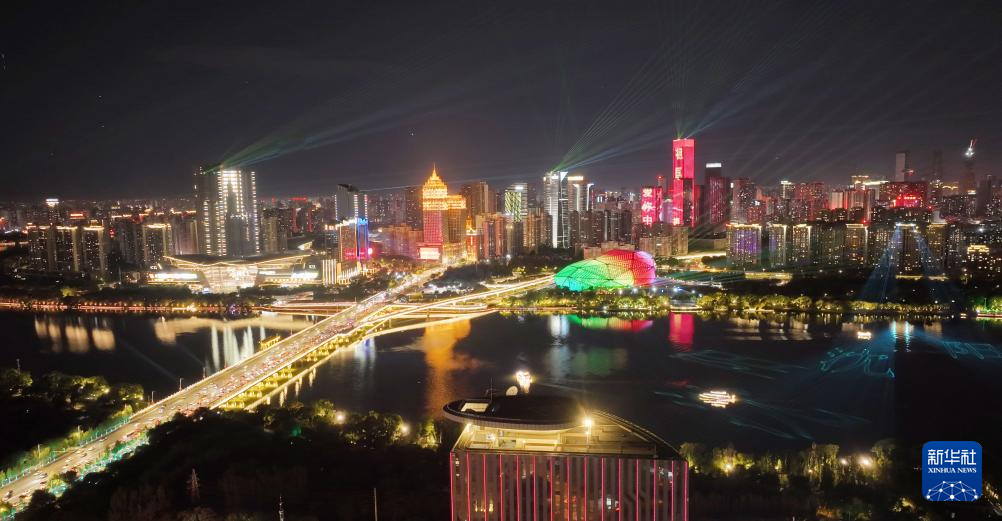 10月1日在遼寧沈陽拍攝的燈光秀(無人機照片)。