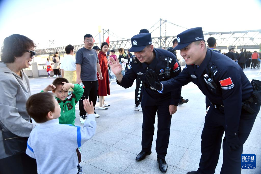 10月3日,丹東邊境管理支隊一經街邊境派出所民警高巖(左),曲宏偉在鴨綠江畔與游客互動。