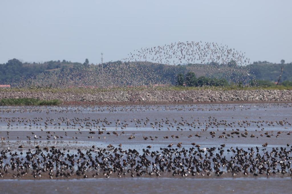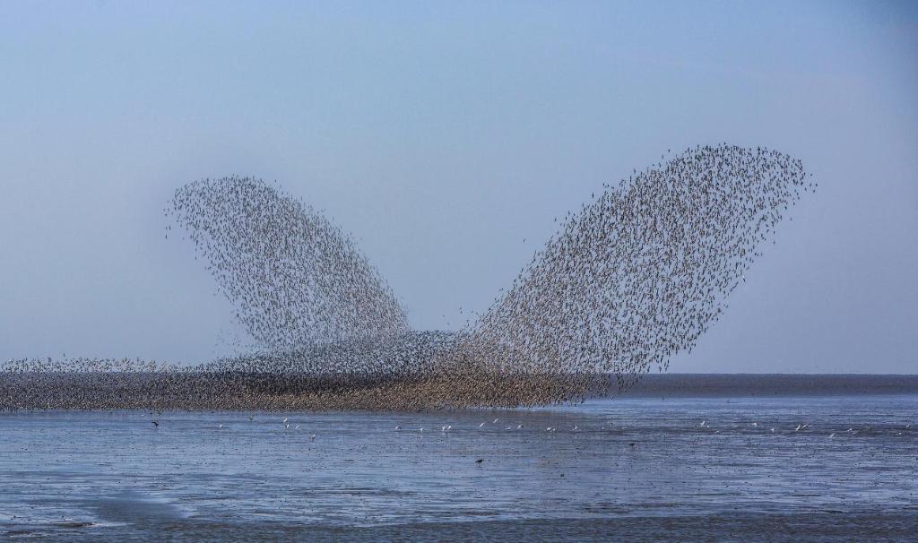 鴨綠江口候鳥棲息地的壯觀“鳥浪”。(鴨綠江口濕地保護中心供圖)