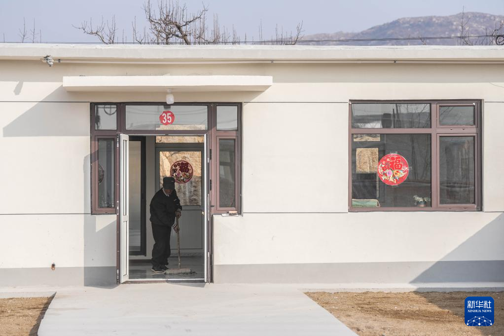 11月8日,遼寧省葫蘆島市綏中縣祝家溝村村民在集中安置重建住房清掃屋子。