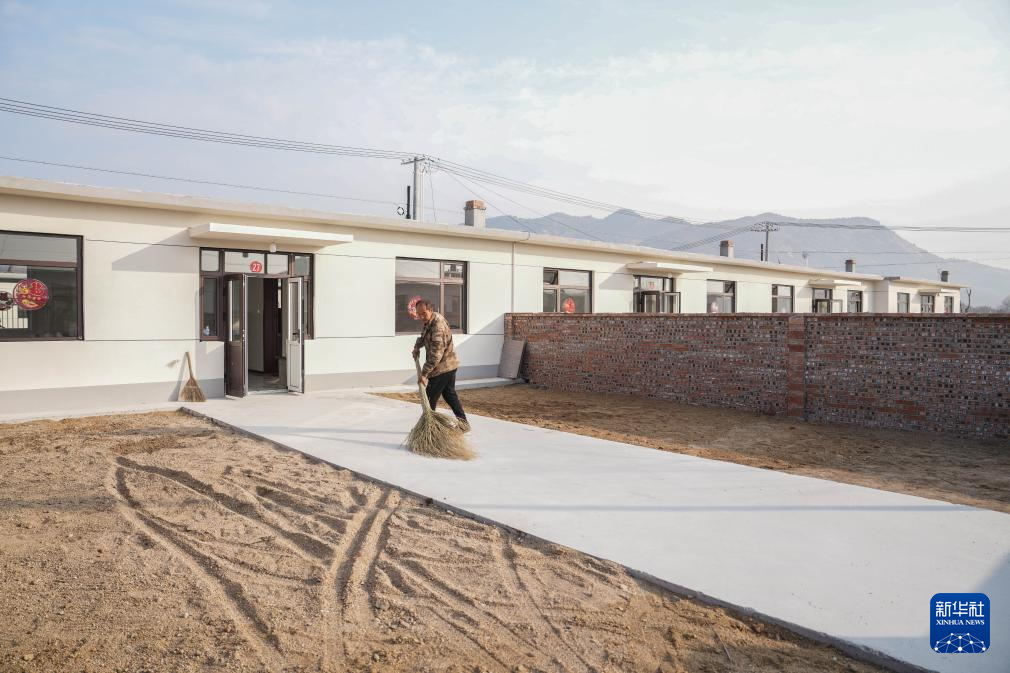 11月8日,遼寧省葫蘆島市綏中縣祝家溝村村民在集中安置重建住房清掃院子。