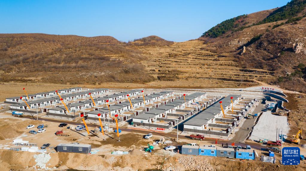 這是11月5日拍攝的遼寧省葫蘆島市綏中縣祝家溝村集中安置重建住房(左側白色房屋,無人機照片)。