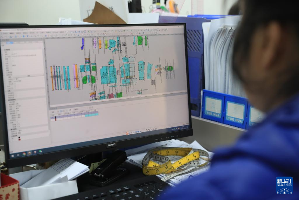 在丹東海合谷實業有限公司,工作人員在設計滑雪服(11月15日攝)。