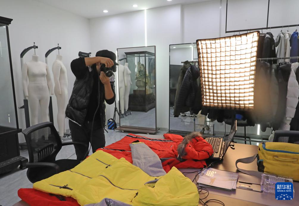 在丹東海合谷實業有限公司,工作人員在給滑雪服拍照(11月15日攝)。