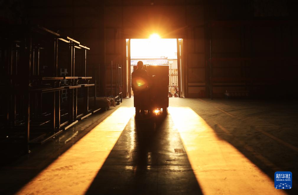 在遼寧飛馬特實業有限公司,工作人員在倉庫搬運滑雪服(11月15日攝)。
