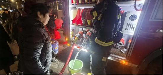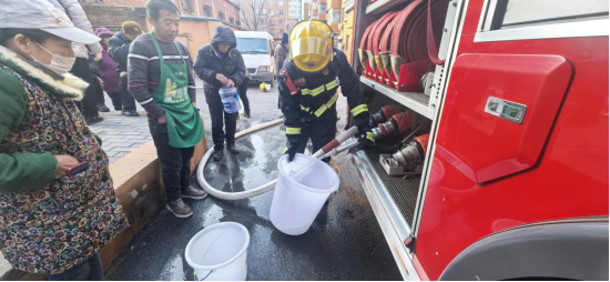 “水來了,消防送水來了!”紅色的消防車駛入小區,居民奔走相告,紛紛拿著水桶、水盆請求打水。消防車在給供熱站供水的同時,也為群眾“開閘放水”,并維持現場秩序,避免擁擠發生意外。