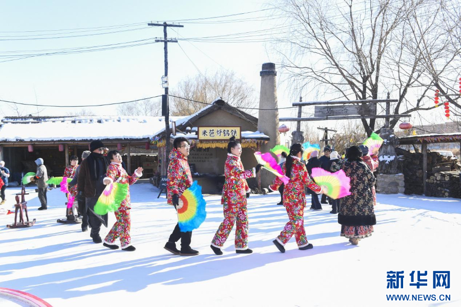 圖為葫蘆古鎮內游客和古鎮演員一起體驗東北大秧歌