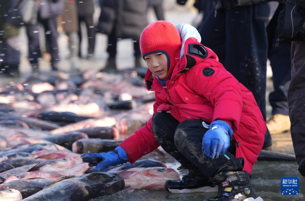 1月11日,游客在沈陽康平臥龍湖近距離觸摸冬捕大魚。
