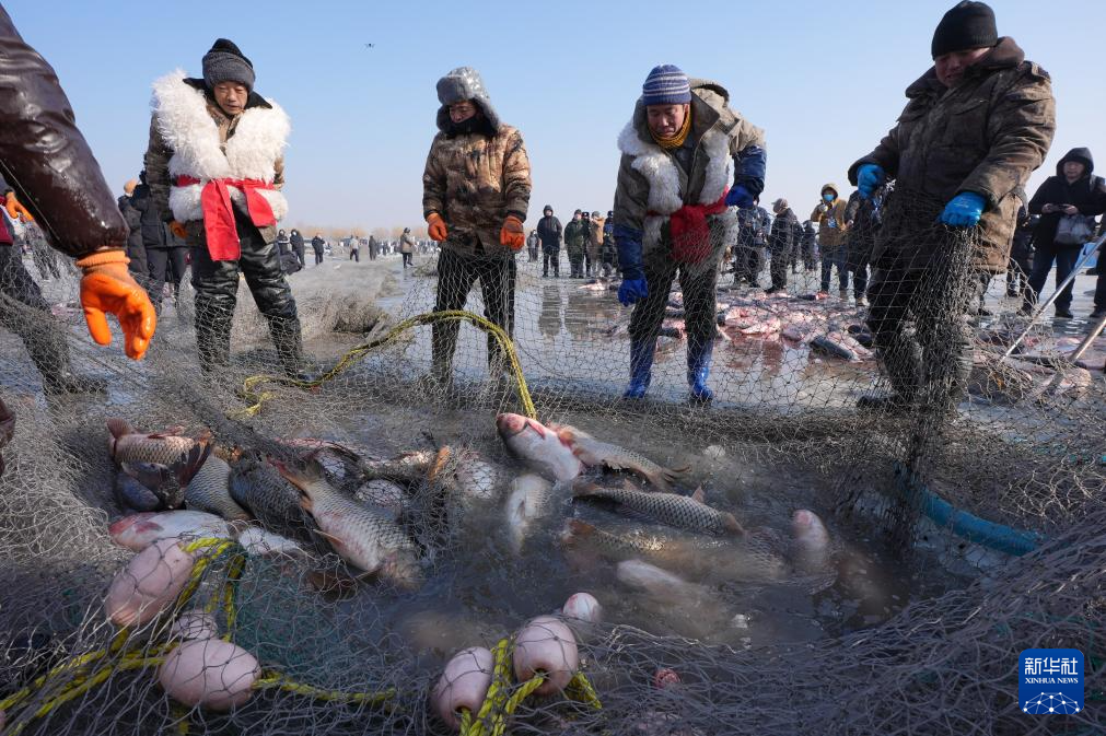 這是1月11日在沈陽康平臥龍湖拍攝的冬捕出魚現場。