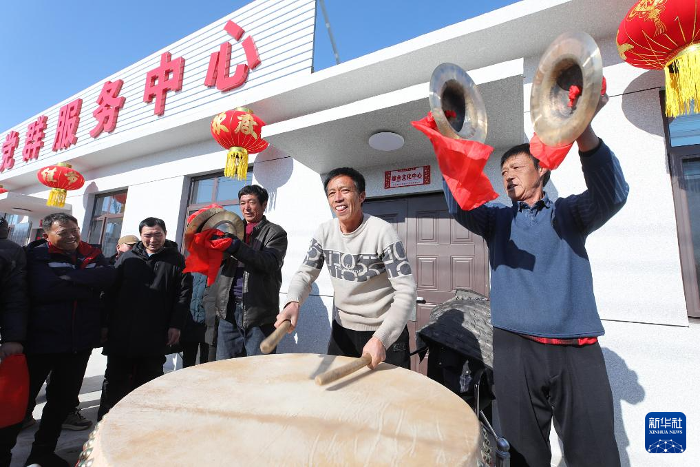 1月28日,葫蘆島市綏中縣明水滿族鄉祝家溝村村民在重建新房的村黨群服務中心前鳴鑼擊鼓。