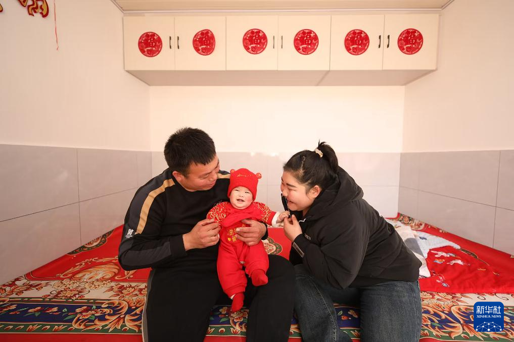 1月28日,葫蘆島市綏中縣明水滿族鄉祝家溝村村民朱西維(左)和妻子在重建新房內與孩子互動。