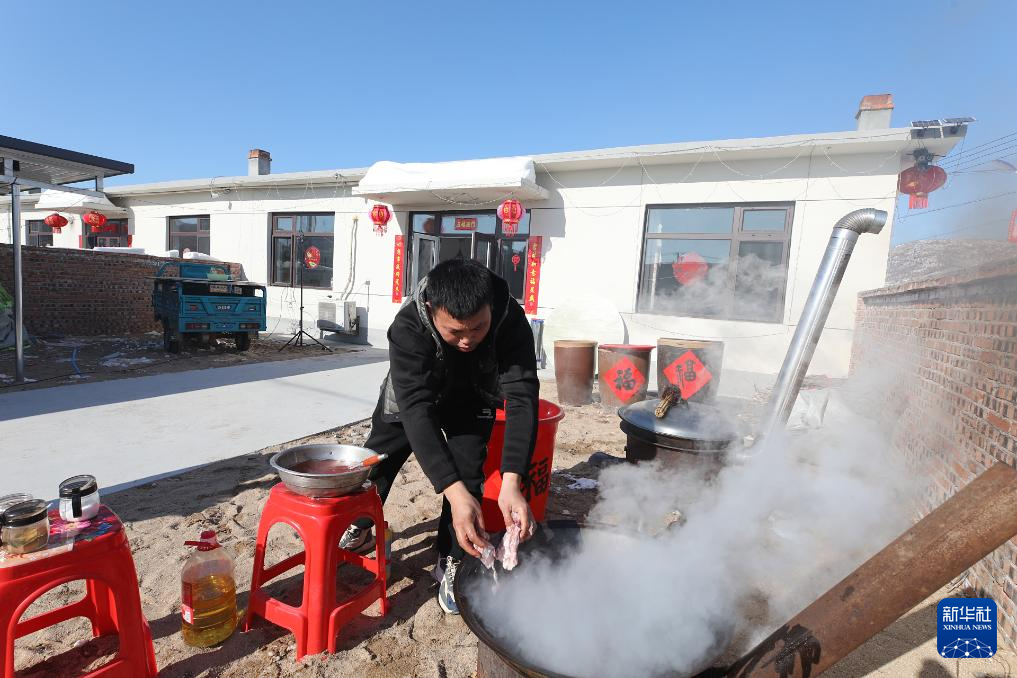 1月28日,葫蘆島市綏中縣明水滿族鄉祝家溝村村民朱西維在重建新房院子里做菜。