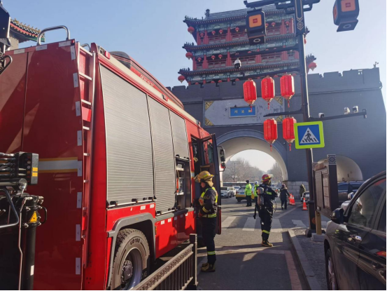 1月24日上午,在巍峨的撫近門下,四輛消防車排成一排,沈陽市沈河區故宮消防救援站的消防救援人員整裝齊備,準備進行一場針對沈陽故宮周邊涉旅場所的消防演練。